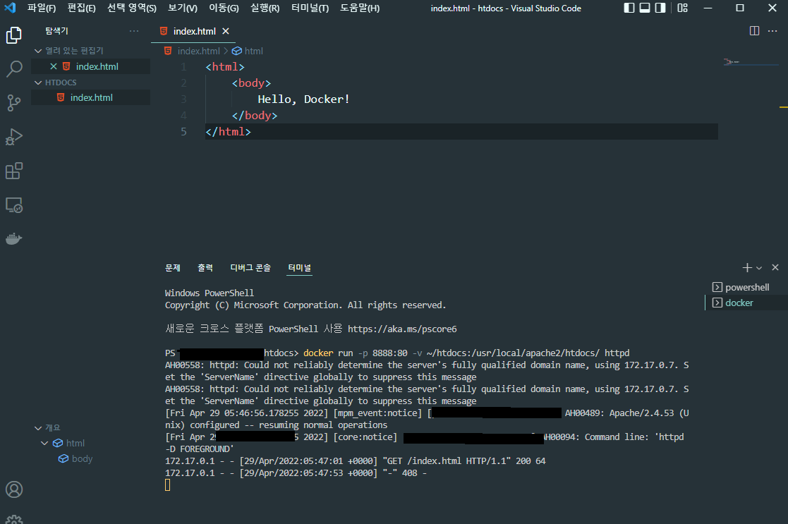 예를 들어 docker에 File System 안에 있는 indexhtml 파일을 직접 수정했다고, 가정 해보자