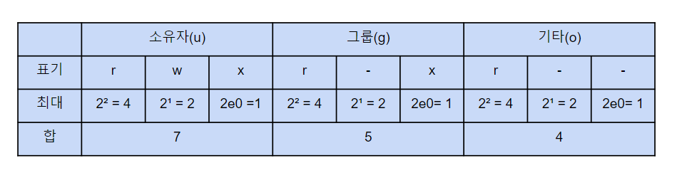 - 그룹 : 소유자가 속해 있는 그룹에 대한 권한