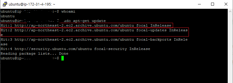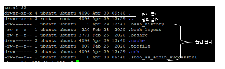 그래서 login을 해서 들어가면 자신의 id가 있다. 원래는 [ip주소]만을 가지고 접속을 한다. 하지만 실습은 ssh라는 특별한 기능을 사용해서 (ubuntu@[ip주소]) ubuntu라는 id로 접속을 하는 것이다. ssh 접속은 key 파일을 가지고 접속을 하는 것 이므로, 별도의 password가 필요하지는 않다.