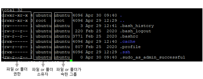 - 파일마다 소유자, 소유자 그룹, 모든 사용자에 대해