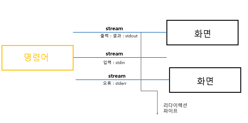 - command로 실행되는 프로세스는 세가지 스트림을 가지고 있음