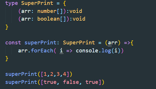 그래서 일단 위의 코드와 같이 SuperPrint type의 함수에 boolean 형태의 배열인자를 받을 수 있는 call signture를 추가 한다.