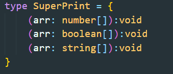 하지만 아직도 stirng type으로 배열을 보내면 제대로 작동하지 않는다. 그렇다면 다시 SuperPrint type 정의 영역에가서 stirng type의 배열을 받는 call signature를 추가 해주어야 할까? 그럴수 있지만 더 효유적이 방법이 존재한다.
