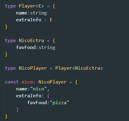 위 코드에서 nico의 type은 Player이다. 그리고 Player에는 "<>" 꺽쇠 안에 type을 필수로 넣어 주어야 한다.