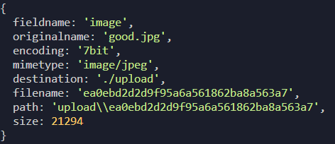 @UploadedFile()통해 메서드에 전단된 인자file의 console출력 결과이다.