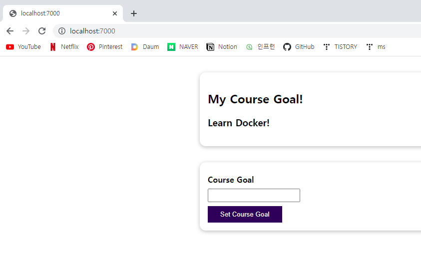 이제 새로 만들어진 custom image를 사용해서 Container를 실행하고 브라우저를 통해 localhodt:7000에 접속하면