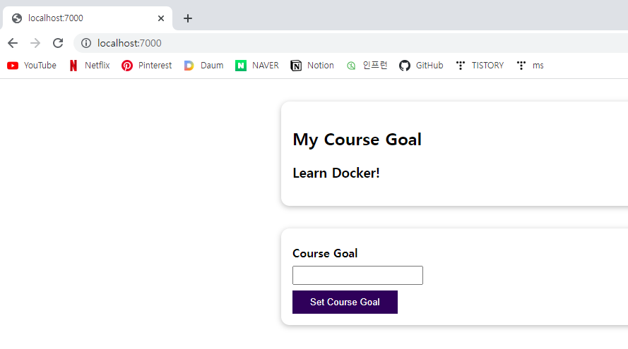 const express = require("express"); const bodyParser = require("body-parser"); const app = express(); let userGoal = "Learn Docker!"; app.use( bodyParser.urlencoded({ extended: false, }) ); app.use(express.static("public")); app.get("/", (req, res) => { res.send(` <html> <head> <link rel="stylesheet" href="styles.css"> </head> <body> <section> <h2>My Course Goal</h2> <h3>${userGoal}</h3> </section> <form action="/store-goal" method="POST"> <div class="form-control"> <label>Course Goal</label> <input type="text" name="goal"> </div> <button>Set Course Goal</button> </form> </body> </html> `); }); app.post("/store-goal", (req, res) => { const enteredGoal = req.body.goal; console.log(enteredGoal); userGoal = enteredGoal; res.redirect("/"); }); app.listen(8080);<section> //<h2>My Course Goal</h2> <h2>My Course Goal!</h2> <h3>${userGoal}</h3> </section>노드 Application 에서 코드를 변경하고 싶다고 가정하자 아래와 같이 <h2>의 tag의 문구를 변경하고 싶다고 가정하면 이것은 실행 중인 어플리케이션에 반영되어야 하는 HTML 코드에 대한 아주 작은 변경사항이다.