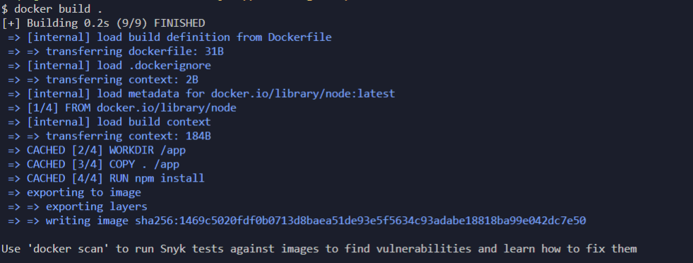 이는 Docker package.json에는 변경사항이 없음을 확인하고 노드 Application에 종속성을 설치한는 과정을 모두 캐시에서 가져왔기 때문이다.