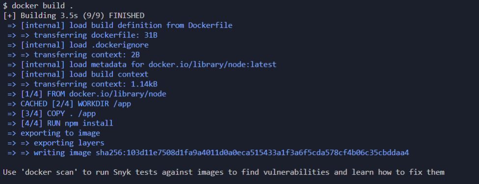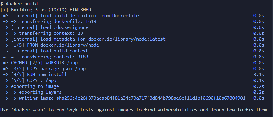 이제 수정된 Dockerfile을 다시 build하면 [3/5]~[4/5] 단계에서 npm install을 실행하여 종속성을 실행하고 [5/5]단계에서 프로젝트의 소스코드들을 COPY해 오는 것을 확인할 수 있다.