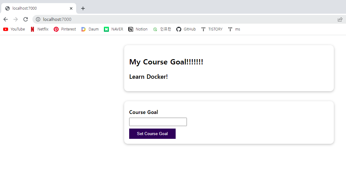 위에서 build한 custom image를 사용하여 Container를 run하고 브라우저를 통해 localhost:7000에 접속하면 이전에 변경한 소스 코드 <h2> 태그를 제외하고는 별다른 이전의 접속한 노드서버와 별다른 차이점이 없다는 것을 확인할 수 있다.