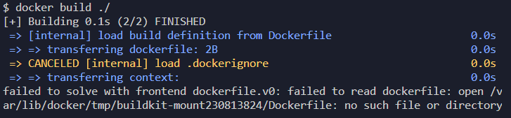 error가 발생하는 이유는 원래 이미지를 빌드할 때 해당 하는 디렉토리만 정해주면 dockerfile을 자동으로 찾아서 build하는 데 현재는 dockerfile이 존재하지 않고 dockerfile.dev밖에 존재하지 않는다. 즉 해당하는 디렉토리 안에 dockerfile이 없다고 인식하므로 이런 error가 발생하는 것이다.
