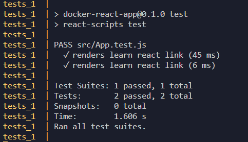 위와 같은 설정을 docker-copomse에 추가하게 되면 해당 services를 실행 하게 될때 두개의 컨테이너를 다 시작하게 되므로 먼저 리액트 앱을 실행하고 해당 앱을 테스트도 하게 된다.