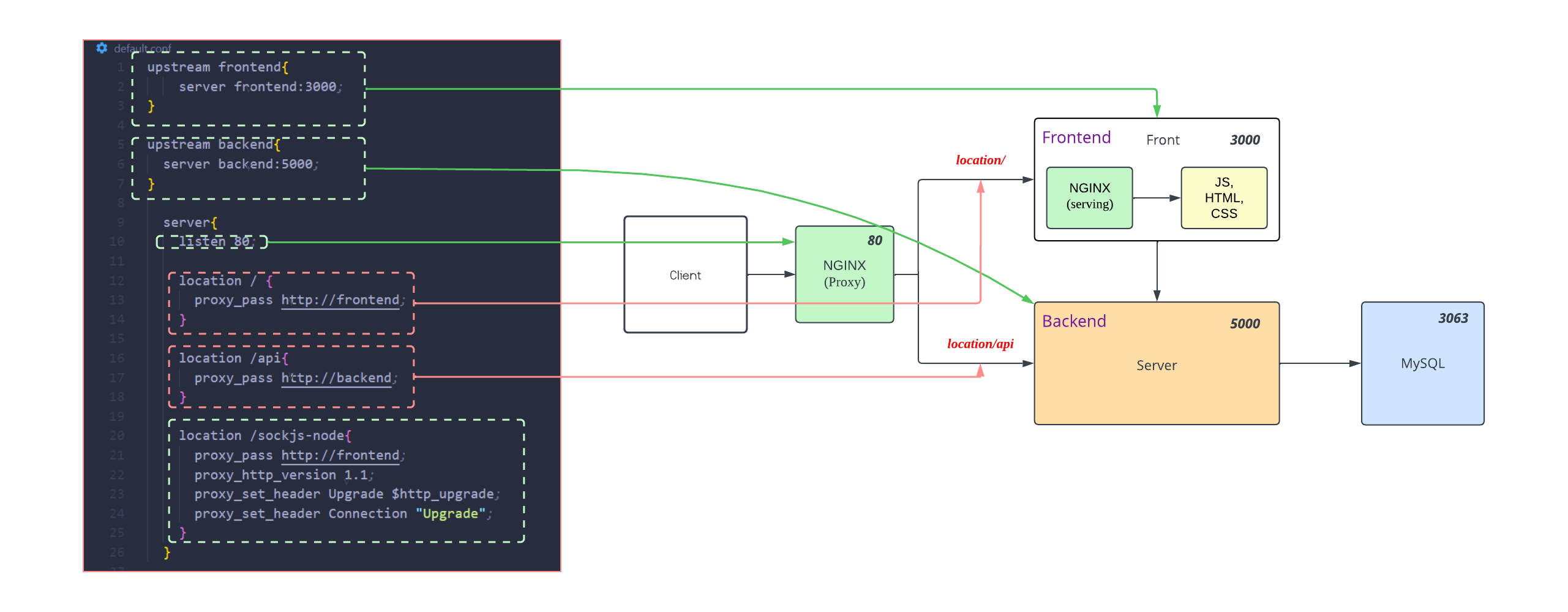 upstream frontend{ server frontend:3000; } upstream backend{ server backend:5000; } server{ listen 80; location / { proxy_pass http://frontend; } location /api{ proxy_pass http://backend; } location /sockjs-node{ proxy_pass http://frontend; proxy_http_version 1.1; proxy_set_header Upgrade $http_upgrade; proxy_set_header Connection "Upgrade"; } }
