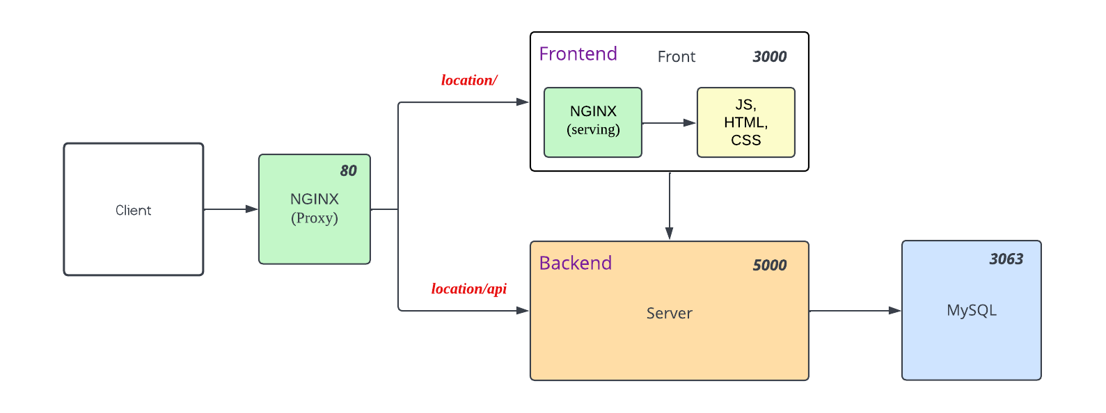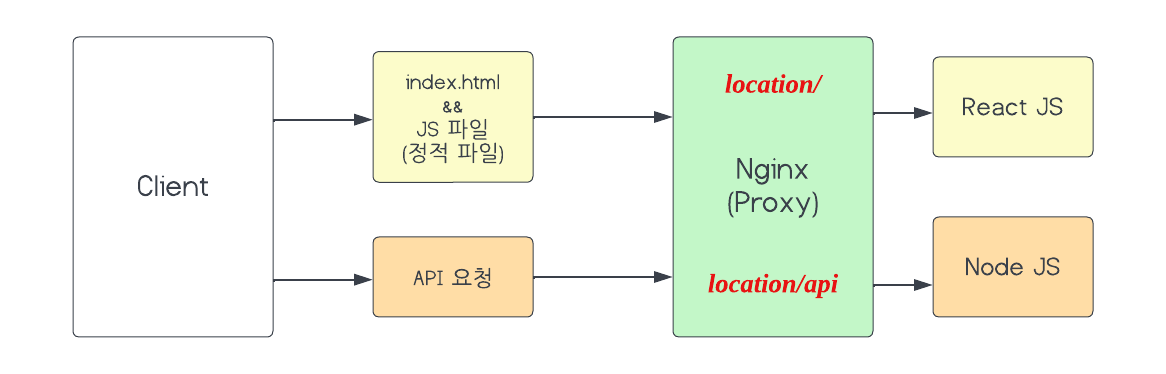 클라이언트에 요청을 보낼때 정적 파일을 원하는 경우 Nginx 설정에 따라 자동적으로 ReactJS를 통해 응답을 보내주고, API 요청일 경우에는 NodeJS를 통해 응답을 보내준다.