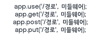 첫 번째 파라미터로 넣어준 경로로 요청이 들어오면 두 번째 파라미터의 미들웨어를 실행한다. 두번째 파라미터는 라우팅 로직 함수를 콜백형태로 구현한 것이고 해당 주소의 요청을 받으면 해당 미들웨어가 어떤 작업을 수행하게 된다.