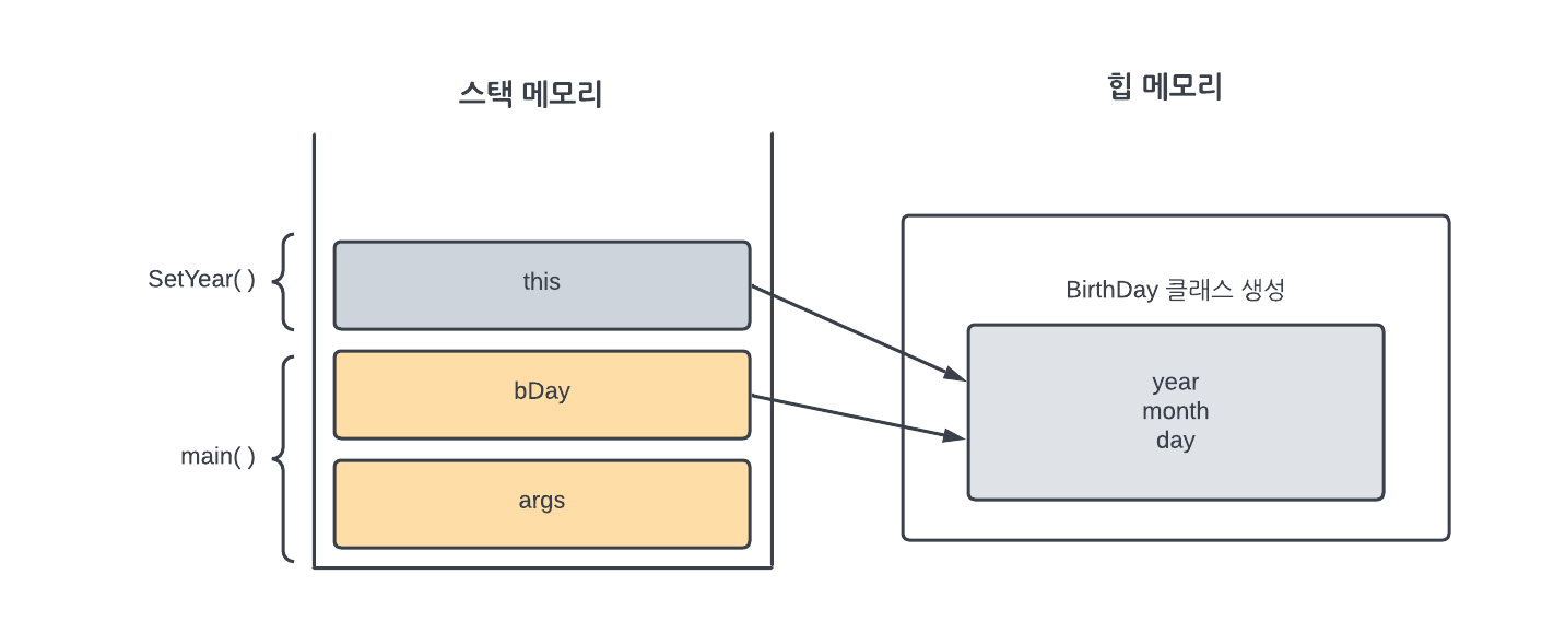 참조 변수는 힙메모리에 생성된 인스턴스의 주소값(참조 값)을 가르키며, 참조 변수를 출력하면 '클래스 이름@메모리 주소'문자열 값이 나온다. 출력 결과를 bDay.printThis()메서드를 호출하여 출력한 this값이 참조 변수 bDay를 출력한 값과 같다. 즉 클래스가 작성된 코드에서 사용하는 this는 생성된 인스턴스 자신을 가리키는 역할을 한다. 따라서 this.year = year; 코드로 참조하면 도정 메모리에 생성된 인스턴스의 year 변수 위치를 가리키고 그 위치에 매개변수 값을 넣어 주는 것이다.
