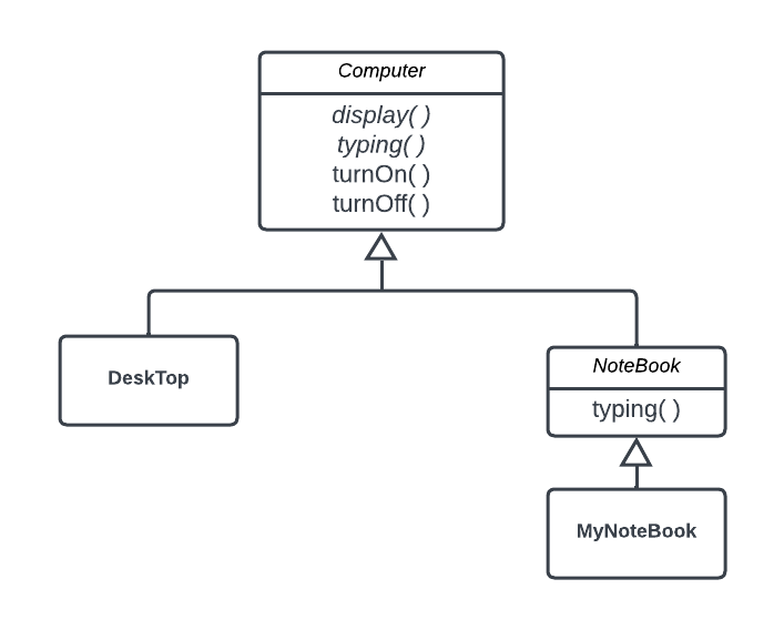 위 그림의 다이어그램에서 Computer클래스는 추상 클래스이며 이를 상속받은 두 클래스 중 DeskTop 클래스는 일반 클래스이고 NoteBook클래스는 추상 클래스입니다. 마지막으로 NoteBook클래스를 상속받은 MyNoteBook 클래스도 일반 클래스이다. Computer클래스가 제공하는 메서드 중 두개는 기울임꼴 서체로 표시했다. 이는 추상 메서드임을 나타낸다. 즉 display()와 typing()은 추상 메서드이고 turnOn()과 turnOff()는 구현 코드가 있는 메서드이다.