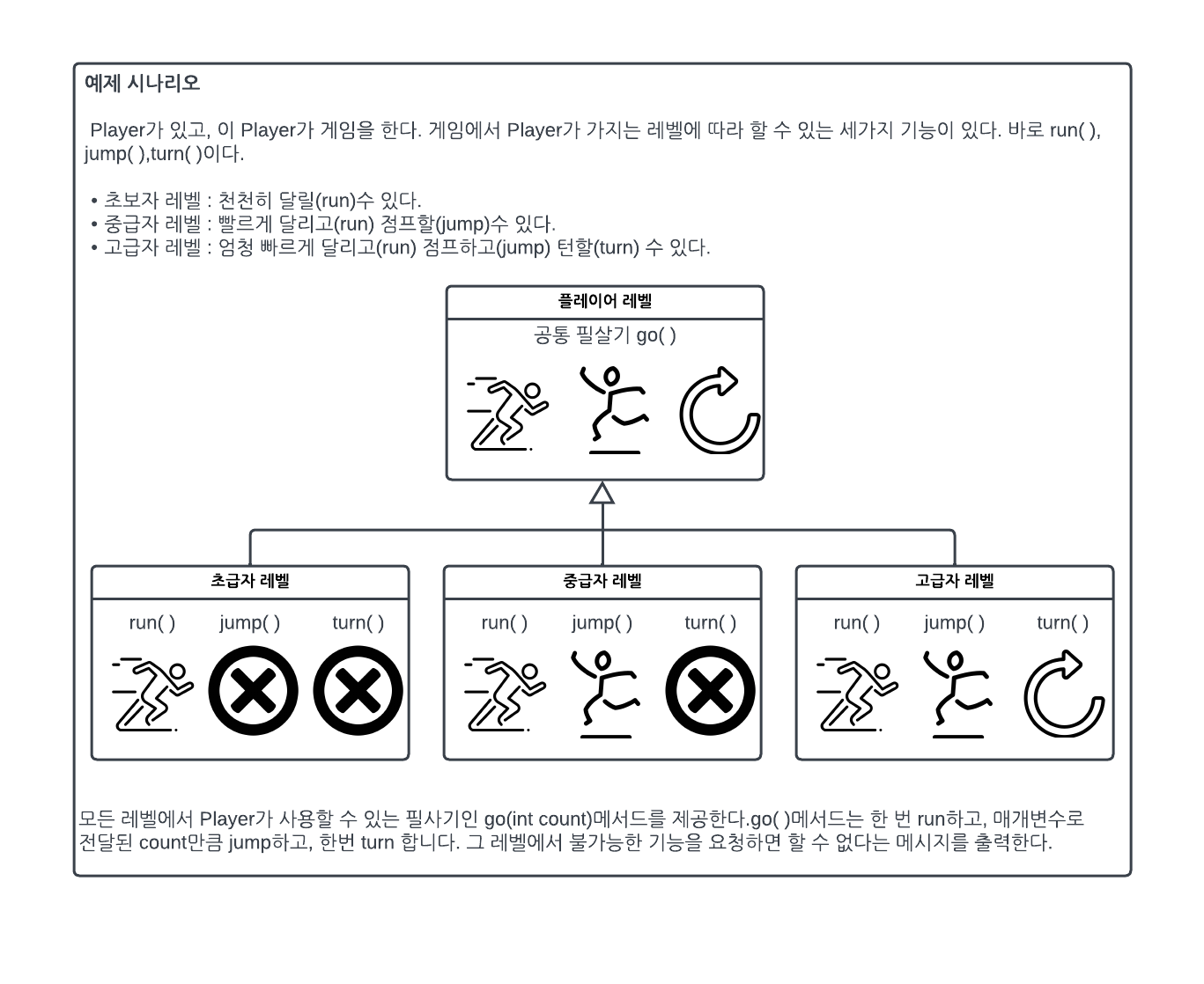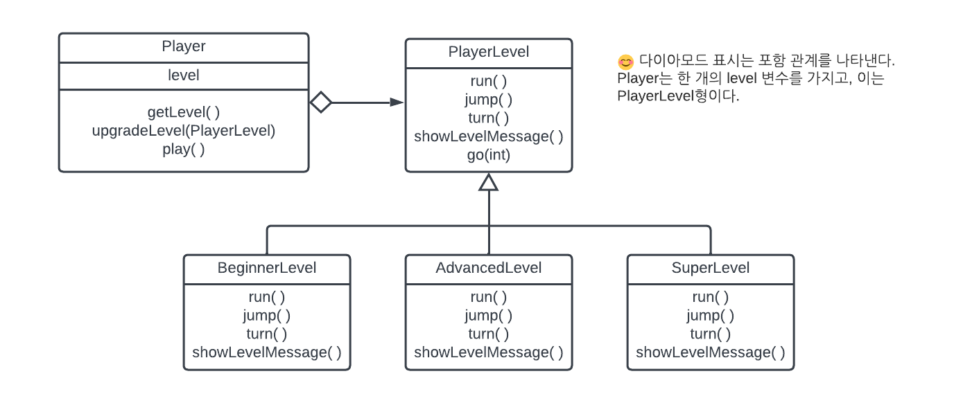 if(level == beginner) //beginner 기능구현 else if(level == advanced) //advanced 기능구현 else if(level == super) //super 기능구현간단하게 생각하면 Player 클래스를 만들고 현재 player의 레벨에 따라 if 조건문으로 코드를 구현하면 된다. 의사 코드(pseudo code)로 작성하면 위 코드와 같다. 그런데 위와 같이 구현하면 level 수만큼 if문이 증가해서 유지보수가 어려운 코드가 된다. 현재는 level이 3개 밖에 없지만, 기능이 추가되어 level이 7개 정도로 늘어난다면 각 level마다 if-else if문을 7개씩 코딩해야 하기 때문이다.
