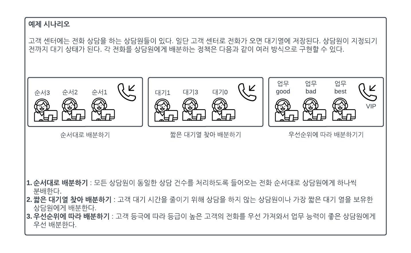 package scheduler; //현재 상담 업무가 없거나 상담 대기가 가장 적은 상담원에게 배분 public class LeastJob implements Scheduler{ @Override public void getNextCall(){ System.out.println("상담 전화를 순서대로 대기열에서 가져온다."); } @Override public void sendCallToAgent(){ System.out.println("현재 상담 업무다 없거나 대기가 가장 적은 상담원에게 할당한다."); } }PriorityAllocation 클래스 구현하기