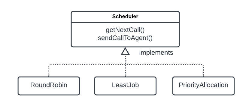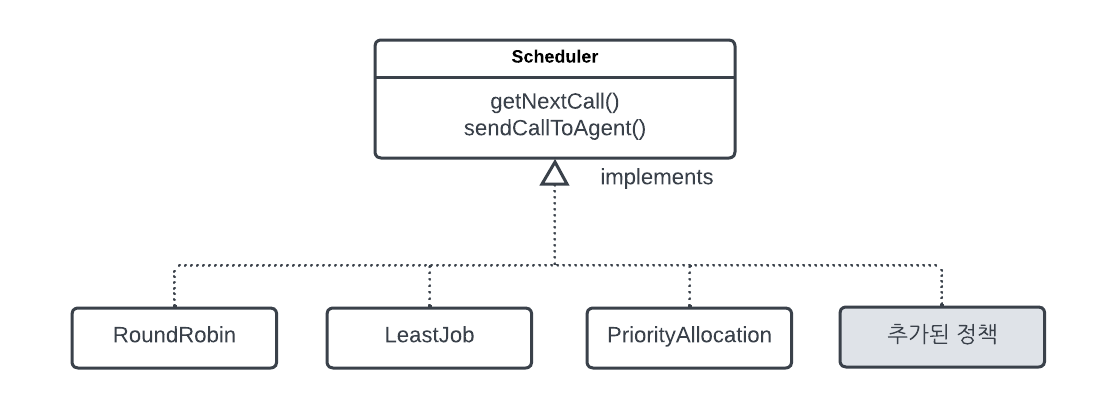 scheduler.getNextCall(); scheduler.sendCallToAgent();앞에서 정의한 상담 전화 배부 정책은 언제든지 바뀔 수 있다. 예를 들어 어느 회사에 이고객 상담 전화 배분 프로그램으 ㄹ팔려고 소개하러 갔더니 그 회사 당담자가 "우리 회사는 상담원에게 상담 전화를 자동으로 배분하는 방식이 아닌, 상담원이 전화를 직접 가져오는 방식을 사용하고 싶습니다."라든가 "우리는 회사 VIP 전담 상담원을 따로 관리하여 VIP는 대기 없이 바로 상담을 받을 수 있게 하고 싶습니다" 등 여러 요구를 할 수 있다. 이런 경우 새로운 전화 배분 정책은 Scheduler 인터페이스를 이용하여 새로운 클래스를 구현하는 식으로 하면된다. 어떤 클래스를 구현하건 클라이언트가 인터페이스를 구현한 클래스를 사용하는 방법위 위 코드와 같다.