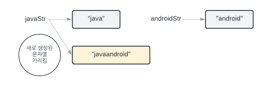 기존에 new 연자를 이용해 생성된 String에 concat()함수를 이용해서 특정 문자열을 연결 후 처음 생성했던 변수에 다시 대입하면 어떻게 될까? 이런 경우 기존에 생성된 문자열이 변경되는 것이 아니라 두 문자열이 연결된 새로운 문자열이 생상된다.