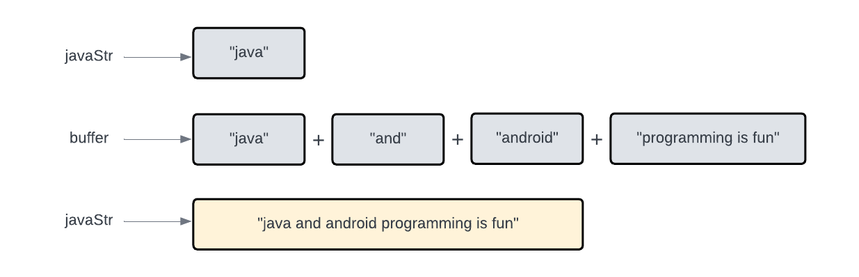 StirngBuffer와 StringBuilder는 내부에 변경 가능한(즉, final이 아닌) char[ ]를 변수로 가지고 있다. 이 두 클래스를 사용하여 문자열을 연결하면 기존에 사용하던 char[ ] 배열이 확장되므로 추가 메모리를 사용하지 않는다. 따라서 문자열을 연결하거나 변경할 경우에 두 클래스 중 하나를 사용하면 된다.