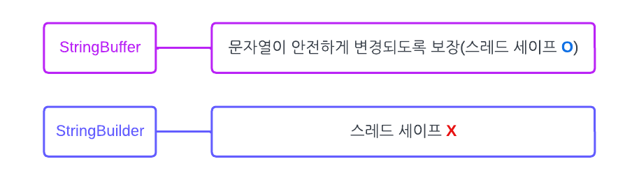 StringBuffer와 StringBuilder의 차이점은 여러 작업(스레드)이 동시에 문자열을 변경하려 할때 문자열이 안전한게 변경되도록 보장을 해주는가 그렇지 않은가의 차이를 가진다.