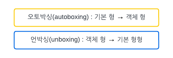 public void setValue(Integer i){...} //객체를 매개변수로 받는 경우 public Integer returnValue(){...} //반환 값이 객체형인 경우보통 정수를 사용할 때는 기본형인 int를 사용했다. 그런데 정수를 객체형으로 사용해야 하는 경우가 있다 위와 같이 매개변수가 객체이거나 반환값이 객체형인 경우이다.