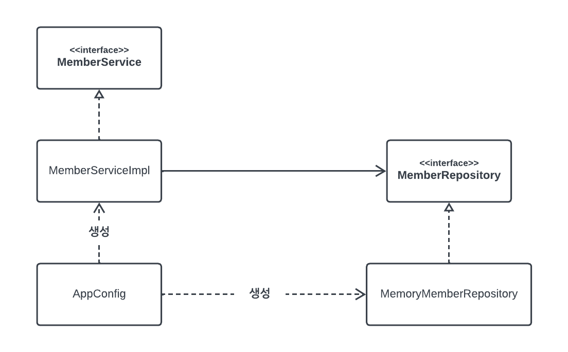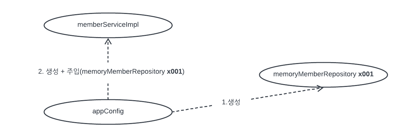 - appConfig객체는 memoryMemberRepository 객체를 생성하고 그 참조값을 memberServiceImple을 생성하는 동시에 생성자로 전달한다.