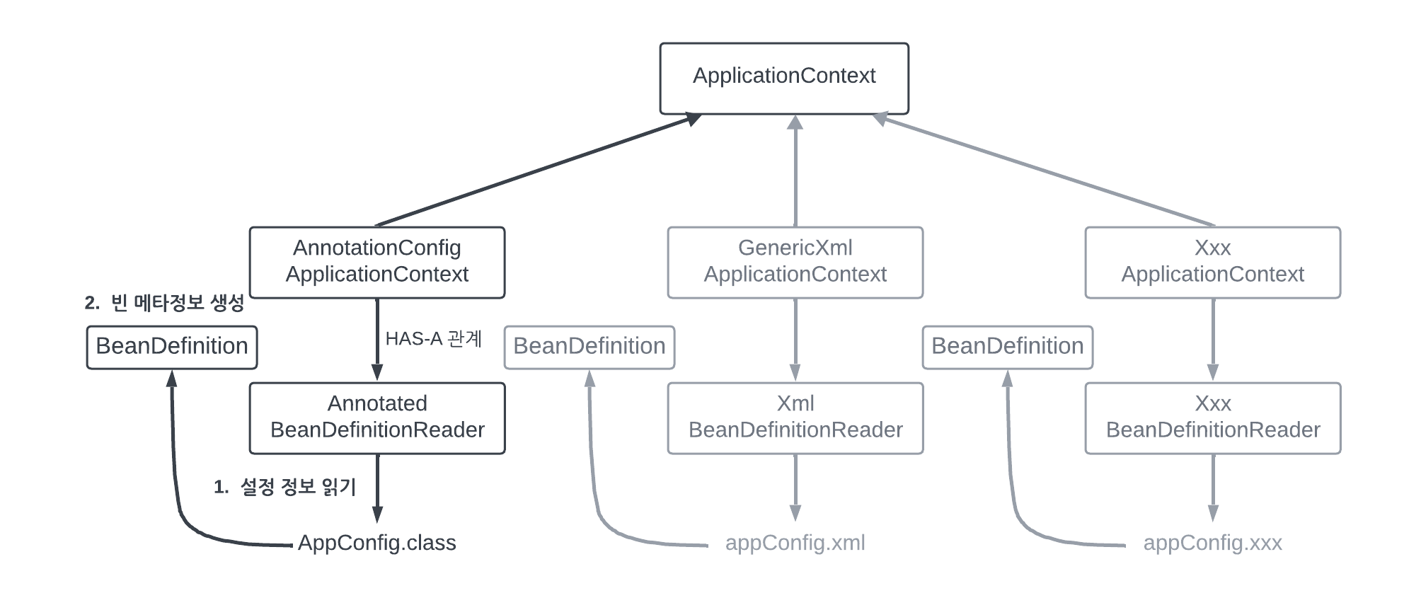 - GenericXml ApplicationContext 는 XmlBeanDefinitionReader 를 사용해서 appConfig.xml를 읽고 BeanDefinition을 생성한다.