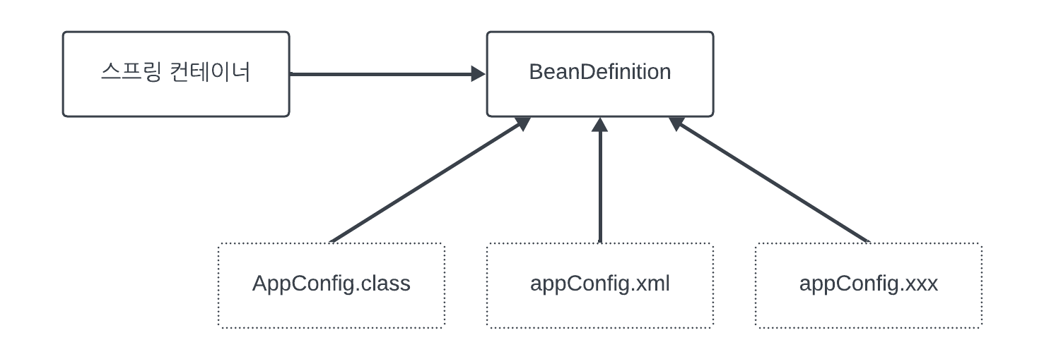 - 스프링 컨테이너는 자바 코드인지, XML인지 몰라도 된다. 오직 BeanDefinition만 알면된다.
