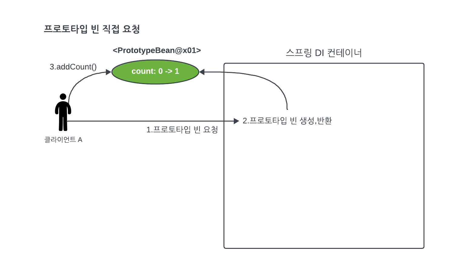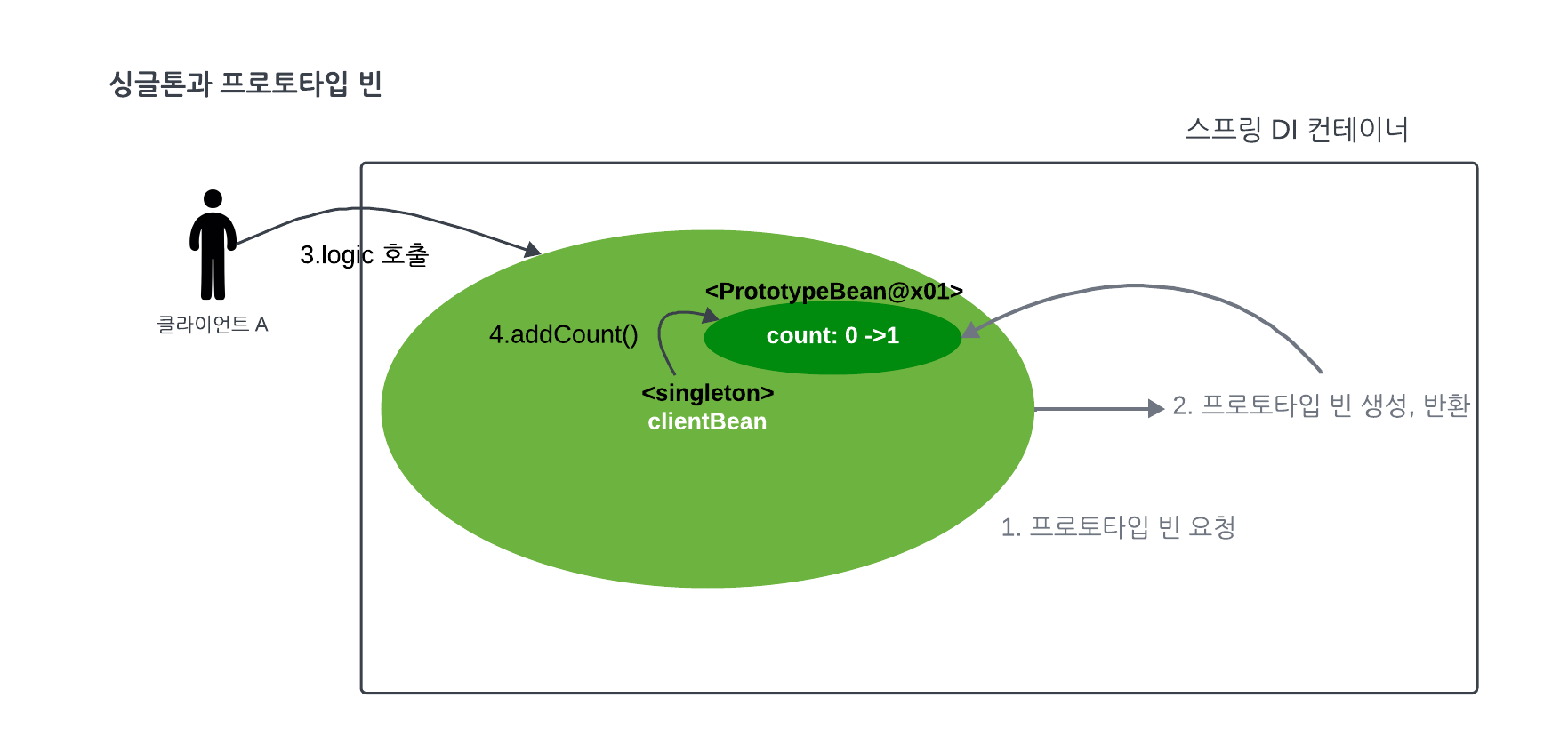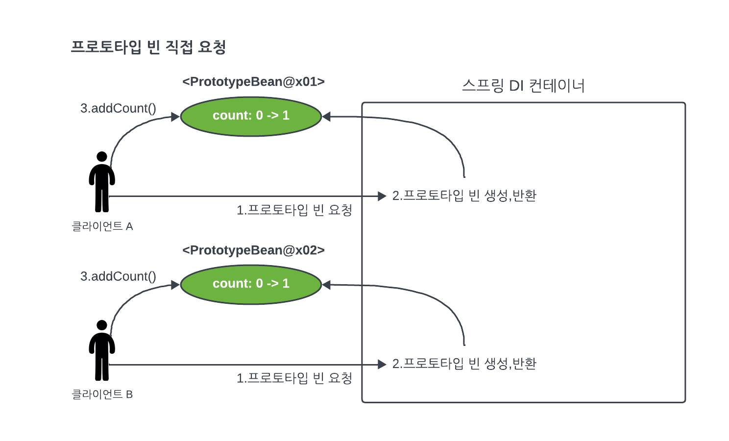 - 2.스프링 컨테이너는 프로토타입 빈을 생성해서 `clientBean`에 반환한다. 프로토타입 빈의 count 필드 값은 0이다.