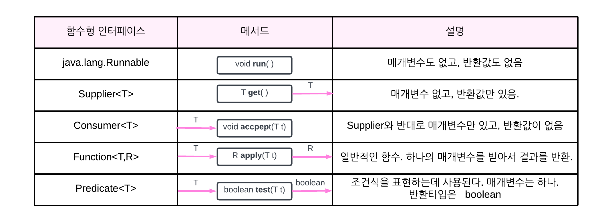 Predicate<String> isEmptyStr = s -> s.length()==0; String s = ""; if(isEmptyStr.test(s)) //if(s.lengh()==0); System.out.println("This is empty String");함수형 인터페이스 Predicate<T>를 사용할 때 람다 함수의 반환 값의 타입은 boolean이어야 한다.