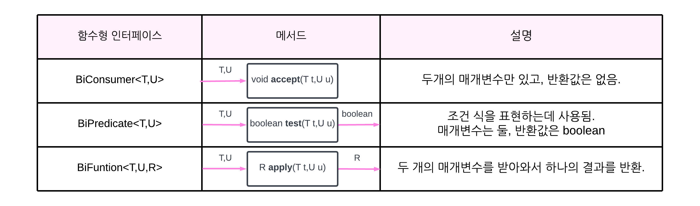 @FunctionalInterface interface TriFunction<T,U,V,R>{ R apply(T t, U u, V v); }매개 변수 3개를 가진 즉 입력을 3개를 받는 함수형 인터페이스는 위 코드 처럼 직접 정의하여 사용할 수 있다.