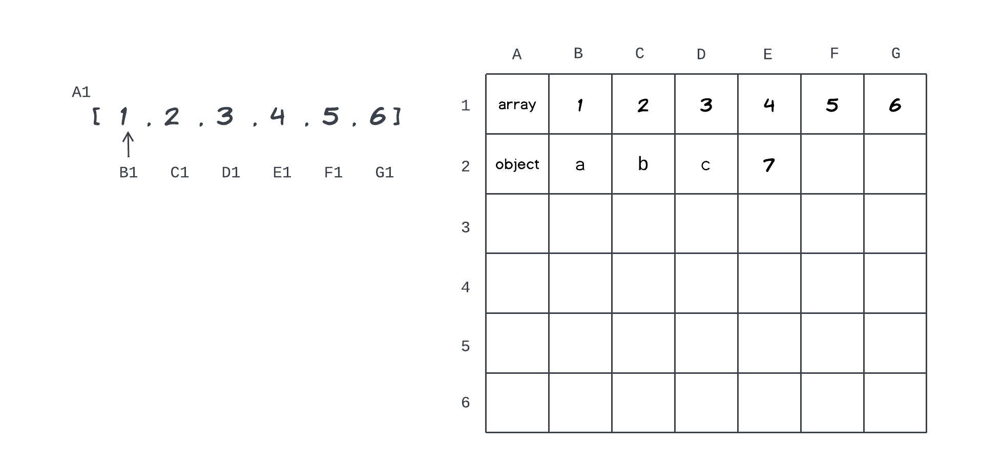 실제로 그렇지는 않겠지만 엑셀처럼 행은 오름차순의 숫자의 주소를 가지고 열은 오름차순의 알파벳 주소를 가진다고 가정하자 그렇다면 array자체의 주소는 A1이고 각각 1 - B1, 2 - C1, 3 - D1, 4 - E1, 5 - F1, 6 - G1의 각각 주소를 가진다. 다른 말로 하면 각 간을 메모리도 다 별개의 주소가 있다.