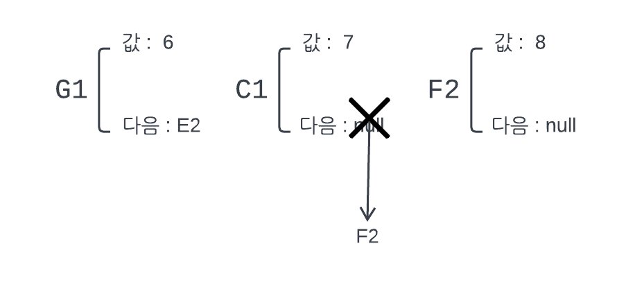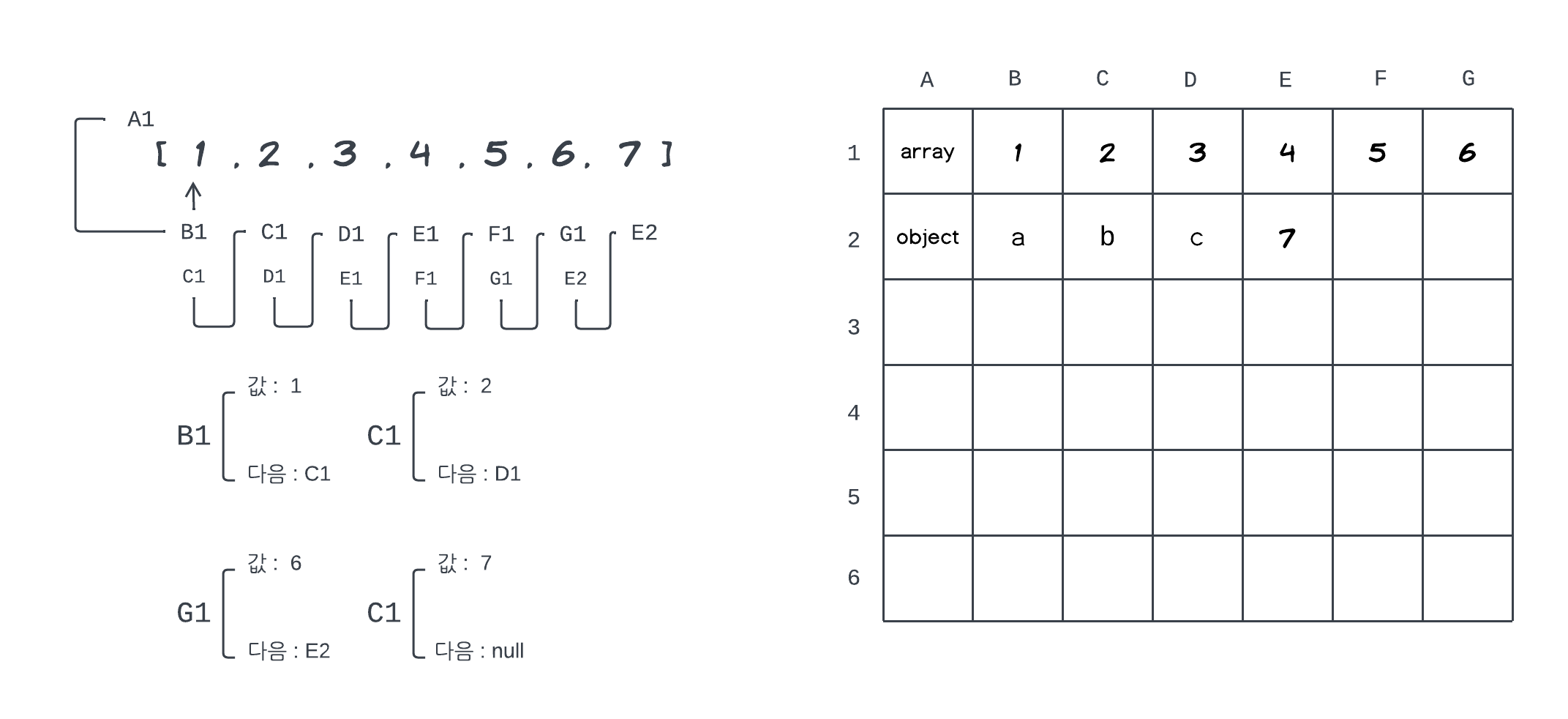 그래서 실제로는 배열의 요소을 하나 저장할때 다음 배열순번의 요소가 어느 위치에 저장이 되어 있는지에 대한 단서를 같이 가진다. 예를 들어 B1이라는 메모리 주소가 있으면, 값으로는 1을 가지고 있고, 이 요소의 다음 순번의 요소는 C1에 저장되어 있다와 같이 두개의 데이터를 가지고 있다. 그래야지 배열의 다음번에 오는 요소가 어느 메모리 주소에 위치하는지 알 수 있다. 배열의 마지막 값은 다음 값에 대해 null을 가진다.