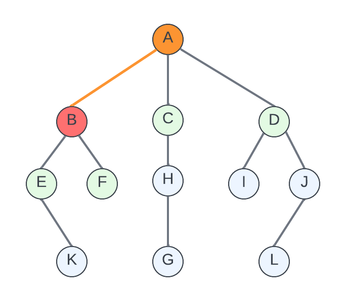 동일 시점에 후보가 된 정점은 어느 것을 선택하든 상관 없다. 여기선 왼쪽에 있는 정점을 선택한다. 모두 동일한 시점에 후보가 됐으므로 B를 선택한다. 선택한 정점으로 이동한다. 현재 있는 B로 부터 도달 할 수 있는 E와 F를 새로운 후보로 추가한다.
