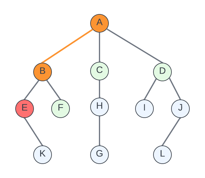 후보인 정점은 '후입선출(LIFO)'구조로 관리하므로 '스택'데이터 구조를 이용할 수 있다. 후보중에 가장 최근에 추가된 것은 E와 F이다. 이중에서 왼쪽에 있는 E를 선택한다. 선택한 정점으로 이동한다. 현재 있는 E에서 도달할 수 있는 K를 새로운 후보로 추가한다.
