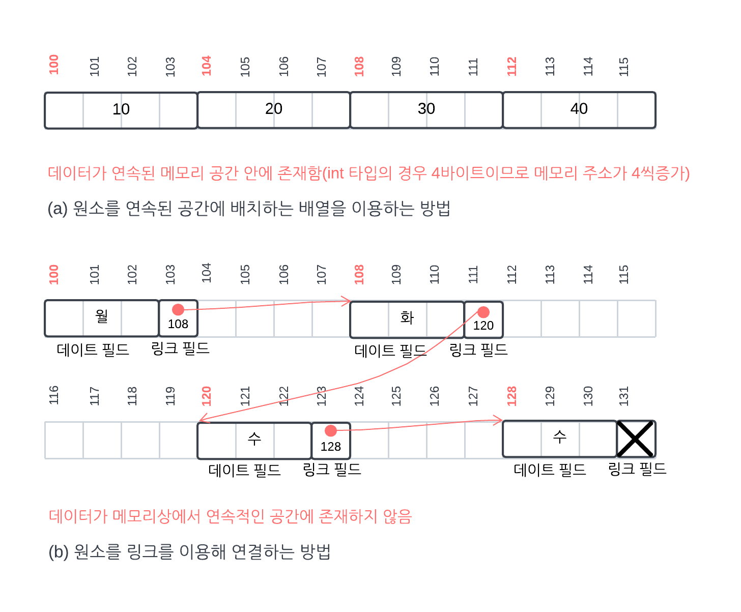 배열을 이용한 리스트는 시작 위치부터 빈자리 없이 자료를 순서대로 연속으로 저장하므로 논리적인 순서와 물리적인 순서가 일치하고 원소를 삽입하거나 삭제해도 빈자리가 없이 자료가 순서대로 연속하여 저장된다. 반면, 연결 리스트를 이용하면 물리적 위치나 순서와 상관없이 링크에 의해 논리적인 수선를 표현하므로 삽입·삭제 연산을 하여 논리적인 순서가 변경되어도 링크 변경되고 물리적 순서는 변경되지 않는다.
