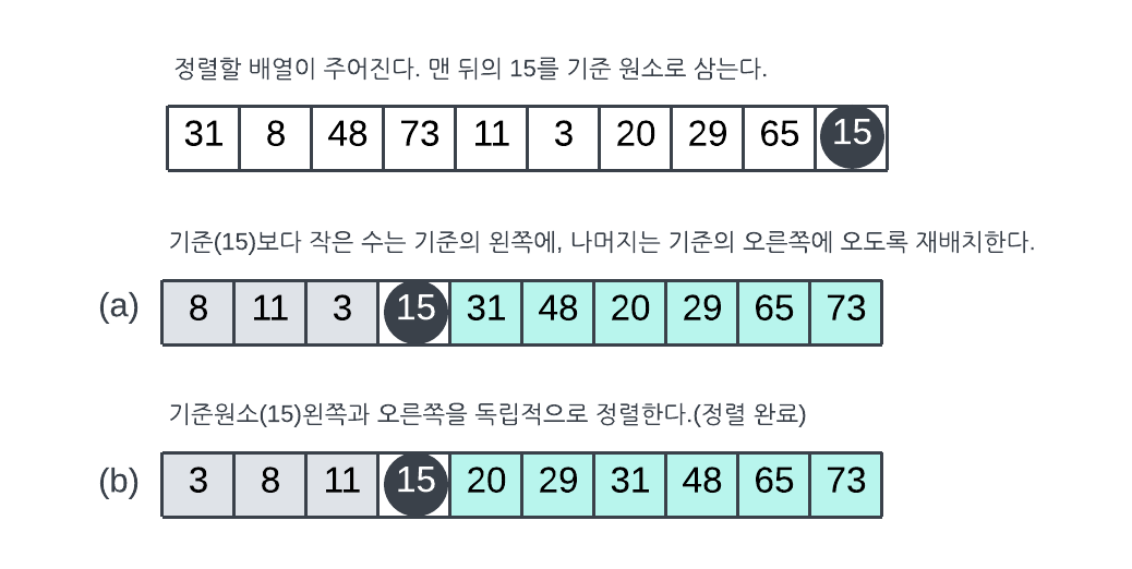 (b)에서 왼쪽의 원소 3개와 오른쪽의 원소 6개를 각각 독립적으로 정렬한다. 왼쪽3개의 원소를 정렬할 때 15의 자리는 영향을 받지 않는다. 오른쪽 6개의 원소를 정렬할 때도 역시 15의 자리 영향을 받지 않는다. 즉, 기준 원소 15는 왼쪽과 오른쪽의 정령을 시작하기 전에 이미 제자리를 찾은 것이다. 왼쪽과 오른쪽의 정렬이 끝나는 순간 전체 배열의 정렬이 끝난다. 왼쪽과 오른쪽의 정렬을 위해서는 다시 퀵 정렬을 사용하면 된다. 즉, 퀵 정렬을 재귀적으로 수행한다.