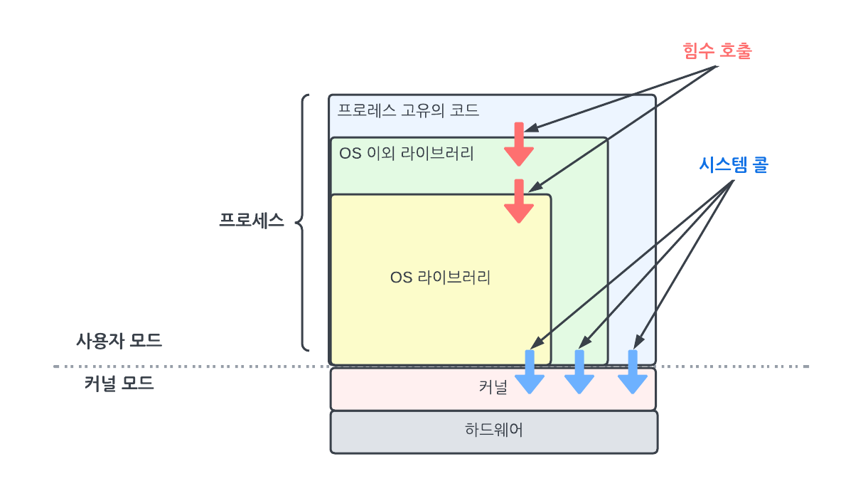 프로세스가 라이브러리를 사용할 때 소프트 웨어 계층은 [그림 01-06]과 같다.
