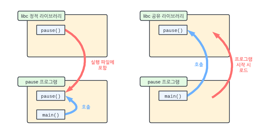 하는일 없이 pause() 시스템 콜만 호출하는 pause.c 프로그램(코드 01-05)을 통해 각 라이브러리 차이점을 설명하는 [그림 01-09]를 살펴보자.