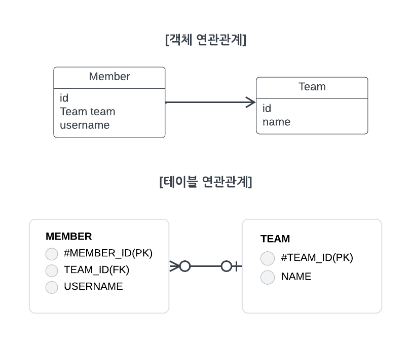 객체는 참조를 사용해서 다른 객체와 연관관계를 가지고 참조에 접근해서 연관된 객체를 조회한다. 반면에 테이블은 외래 키를 사용해서 다른 테이블과 연관관계를 가지고 조인을 사용해서 연관된 테이블을 조회한다.