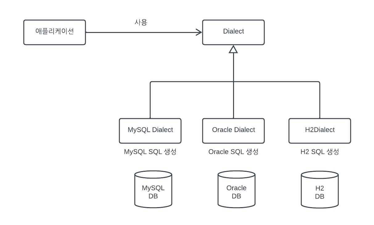 그림 1.10 벤더 독립성 JPA는 위 그림 처럼 애플리케이션과 데이터베이스 사이에 추상화된 데이터 접근 계층을 제공해서 애플리케이션 특정 데이터베이스 기술에 종속되지 않도록 한다.