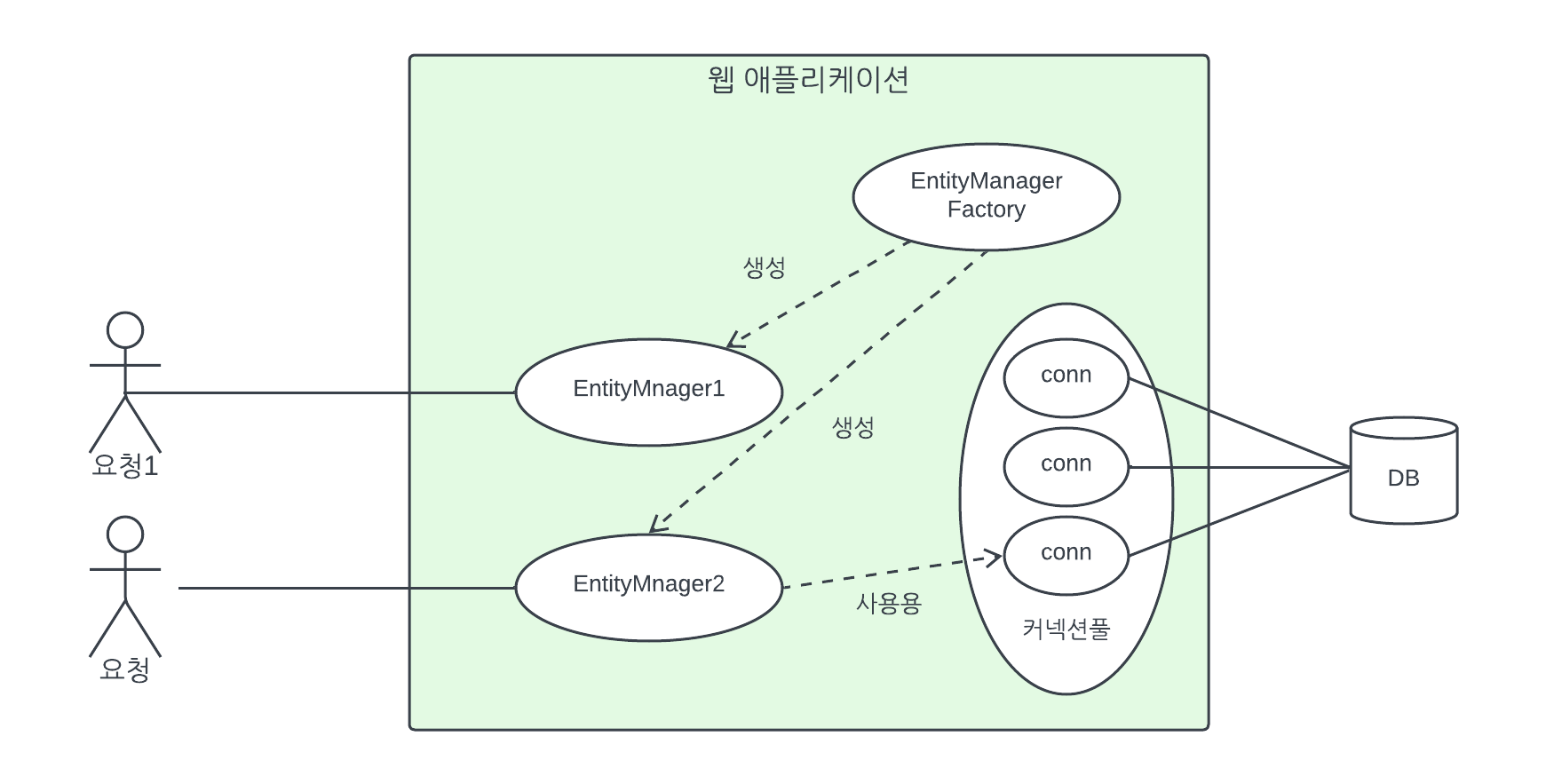 그림 3.1 일반적인 웹 어플리케이션 그림 3.1을 보면 하나의 EntityManagerFactoty에서 다수의 엔티티 매니저를 생성했다. EntityManger1은 아직 데이터베이스 커넥션을 사용하지 않는데, 엔티티 매니저는 데이터베이스 연결이 꼭 필용한 시점까지 커넥션을 얻지 않는다. 트랜잭션을 시작할 때 커넥션을 획득한다.