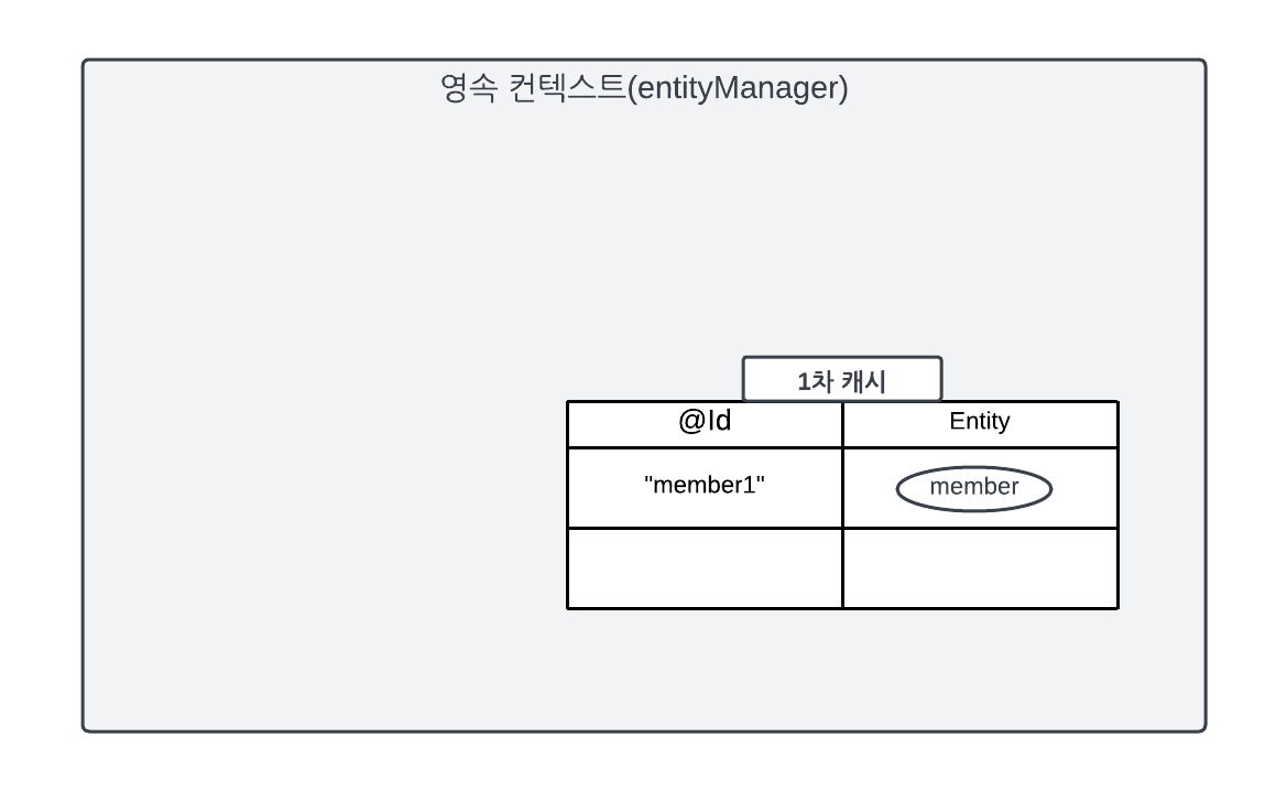 영속성 컨텍스트는 내부에 캐시를 가지고 있는데 이것을 1차 캐시라 한다. 영속상태의 엔티티는 모두 이곳에 저장된다. 쉽게 얘기하면 영속성 컨텍스트 내부에 Map이 하나 있는데 키는 @Id로 매핑한 식별자고 값은 엔티티 인스턴스다.