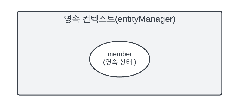 em.persist(member); em.find(memberId); //JPQL엔티티 매니저를 통해서 엔티티를 영속성 컨텍스트에 저장했다. 이렇게 영속성 컨텍스트가 관리하는 엔티티를 영속 상태라 한다. 이제 회원 엔티티는 비영속 상태에서 영속 상태가 되었다. 회원 엔티티는 비영속 상태에서 영속 상태가 되었다. 결국 영속 상태라는 것은 영속상태 컨텍스트에 의해 관리된다는 뜻이다.