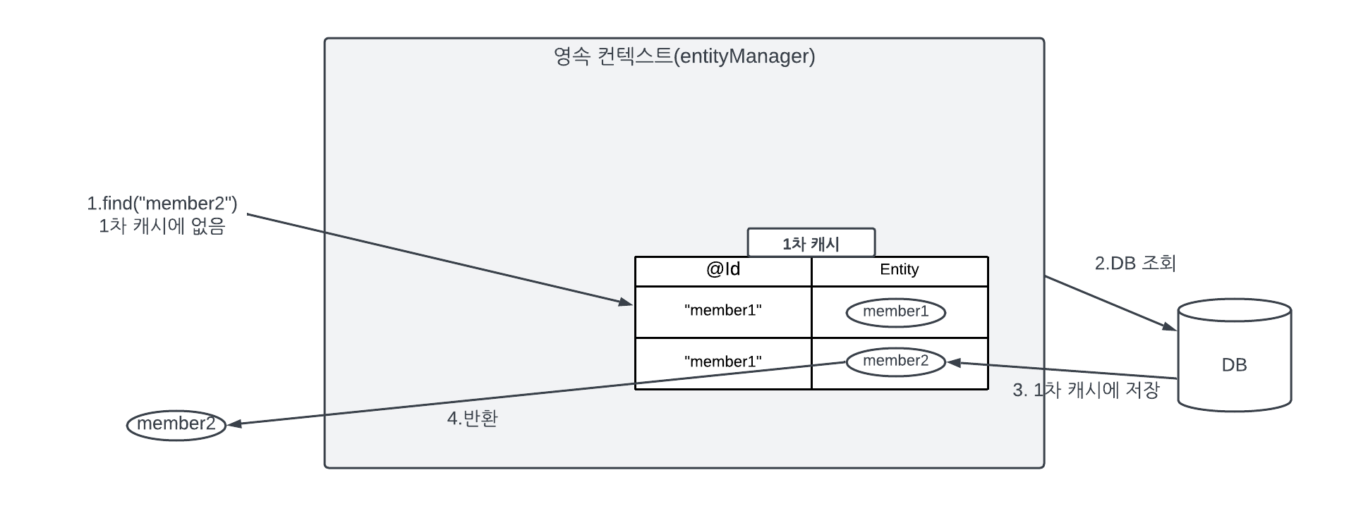 - em.find(Member.class,"member2")를 실행한다.