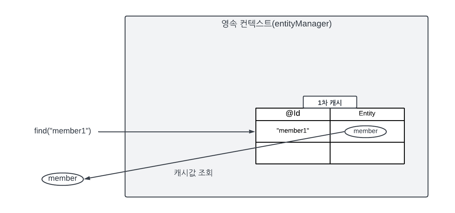 Member member = new Member(); member.setId("member1"); member.setUsername("회원1"); //1차 캐시에 저장됨 em.persist(member); //1차 캐시에서 조회 Member findMember = em.find(Member.class,"member1");위 코드는 1차 캐시에 있는 엔티티를 조회한다.
