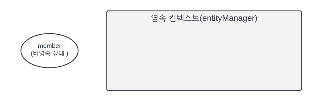 Member member = new Member(); member.setId("member1"); member.setUsername("회원1");엔티티 객체 인스턴스를 막 생성했을 시점이다. 순수한 객체 상태이며 아직 저장되지 않았다. 즉 아직 영속성 컨텍스트나 데이터베이스와는 전혀 관련이 없다. 이것을 비영속 상태라고한다.